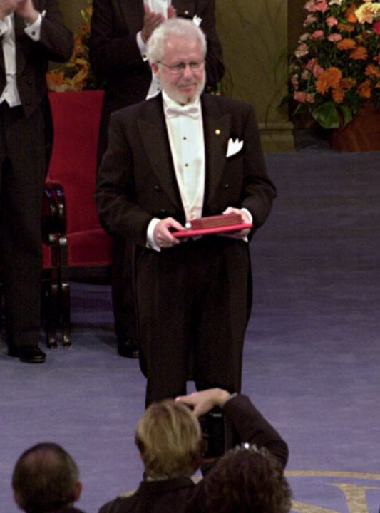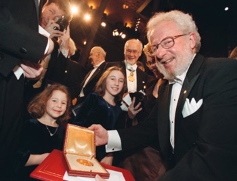 Chemistry Laureate Alan J. Heeger showing his Nobel Prize medal after the Nobel Prize Award Ceremony, 2000.