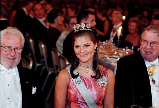 Swedish Crown Princess Victoria with Nobel Laureate in Chemistry Alan J. Heeger (left) and Marcus Storch, Deputy Chairman of the Nobel Foundation (right) at the Nobel Banquet, 10 December 2000.