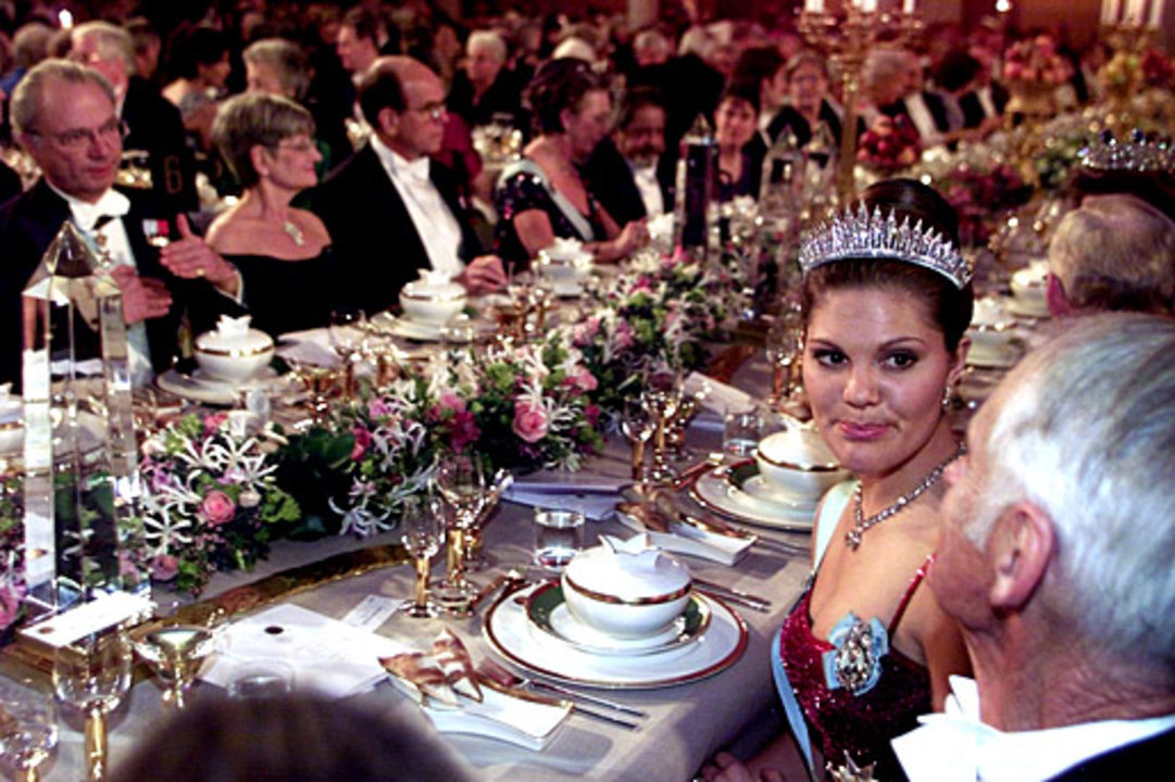 6 (of 6) At the table of honor at the Nobel Banquet, Sweden's Crown Princess Victoria is talking to Nobel Laureate William S. Knowles.