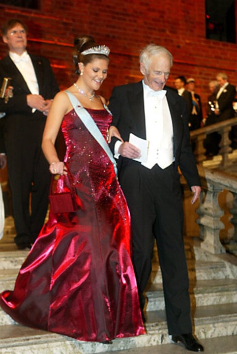 5 (of 6) Crown Princess Victoria of Sweden gracefully goes down the steps of the Stockholm City Hall for the Nobel Banquet, escorted by 2001 Chemistry Laureate, William S. Knowles.