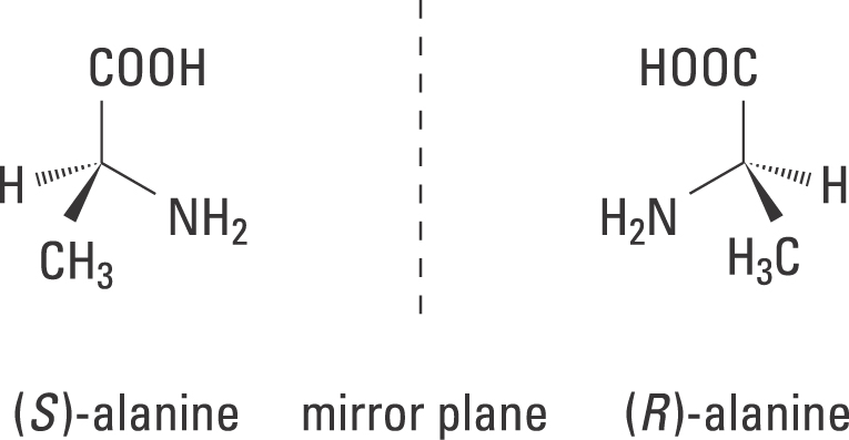 Figure 1. Chirality in the amino acid alanine is illustrated with models of its two forms, which are mirror images of each other. They are designated (S) and (R).
