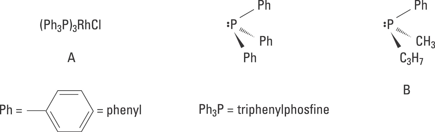 Figure 3. Knowles exchanged the non-chiral phosphine triphenylphosphine in A to the chiral phosphine B and obtained a catalyst for asymmetric hydrogenation.