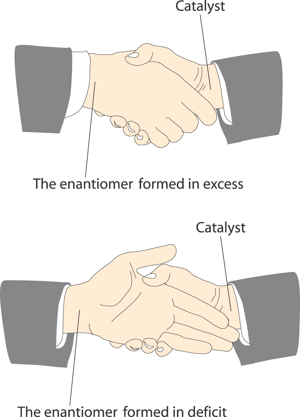 Figure 5. The hands on the right symbolise the catalyst and the hands on the left the products. They match better in the upper picture (the energy is lower) than in the lower picture.