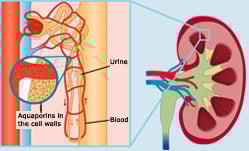 In twenty-four hours, the human kidney produces about 170 litres of primary urine. Fortunately most of this is recovered thanks to a series of cunning mechanisms so that finally only about one litre of urine leaves the body during this time. This recycling machinery consists chiefly of aquaporins – tens of thousands of millions in a single kidney.