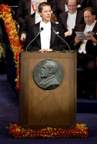 Professor Agre, Professor MacKinnon, your fundamental discoveries concerning water and ion channels are singular achievements that have made it possible for us to see these exquisitely designed molecular machines in action at the atomic level. The biochemical basis for the transport of water – the most abundant and primordial substance of life – and ions – these tiny, mundane and yet absolutely essential constituents of the living world – can now be understood in unparalleled detail. On behalf of the Royal Swedish Academy of Sciences, I wish to convey to you our warmest congratulations, and I now ask you to step forward to receive the Nobel Prize in Chemistry from the hands of His Majesty the King.