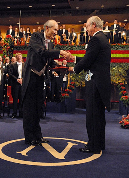 Osamu Shimomura receiving his Nobel Prize from His Majesty King Carl XVI Gustaf of Sweden at the Stockholm Concert Hall, 10 December 2008.