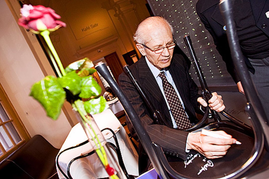 9 (of 9) Osamu Shimomura, like many Nobel Laureates before him, autographs a chair at Kafé Satir at the Nobel Museum in Stockholm, 6 December 2008.