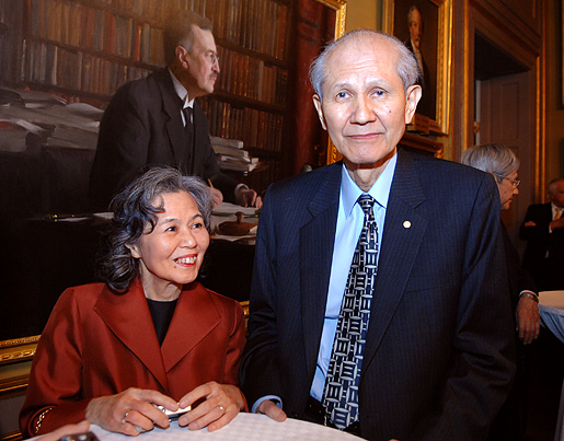 4 (of 9) Osamu Shimomura (right) with his wife Akemi (left) at the reception at the Royal Swedish Academy of Sciences in Stockholm, 7 December 2008.