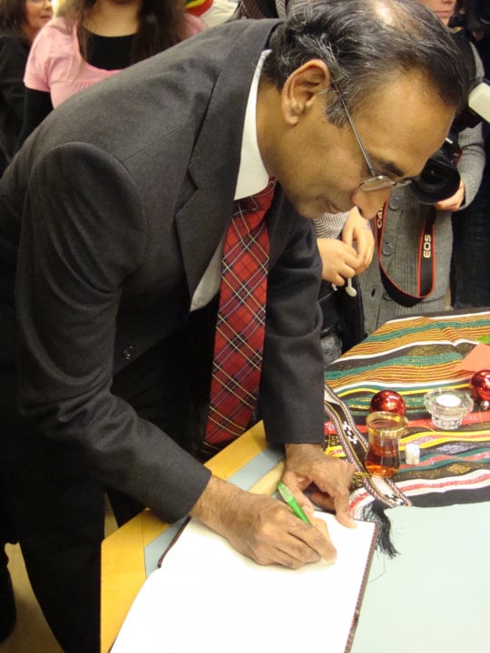 Venkatraman Ramakrishnan signing autographs for pupils during a visit to Rinkeby School in Stockholm on 9 December 2009.