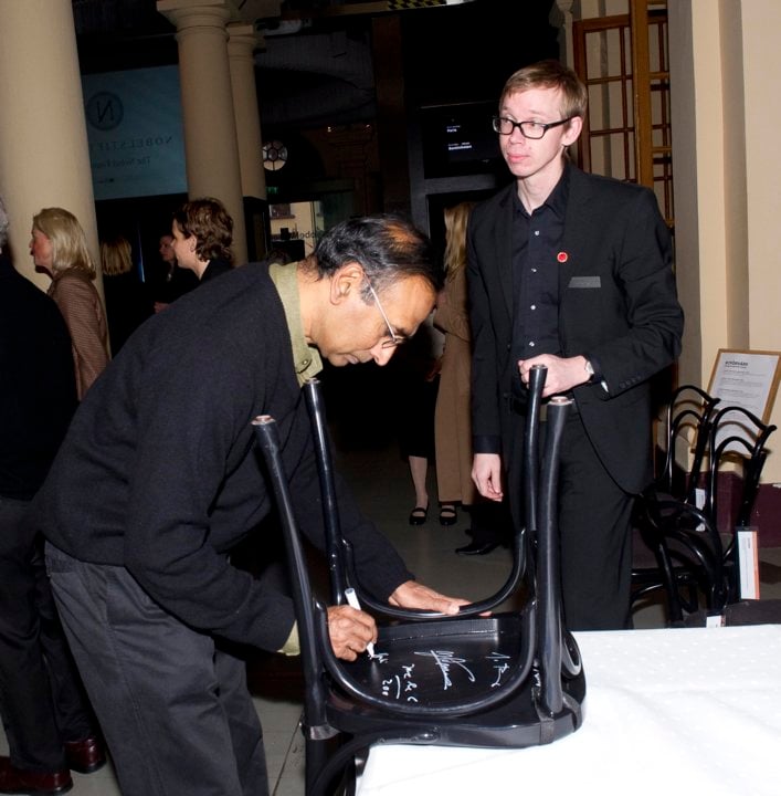 Venkatraman Ramakrishnan, like many Nobel Laureates before him, autographs a chair at Kafé Satir at the Nobel Museum in Stockholm, 6 December 2009.
