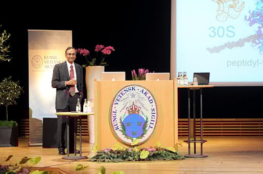 Venkatraman Ramakrishnan delivering his Nobel Lecture at the Aula Magna, Stockholm University, 8 December 2009.