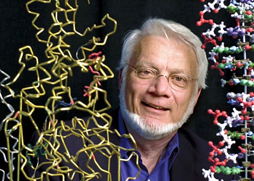 Thomas A. Steitz surrounded by models of molecular structures.