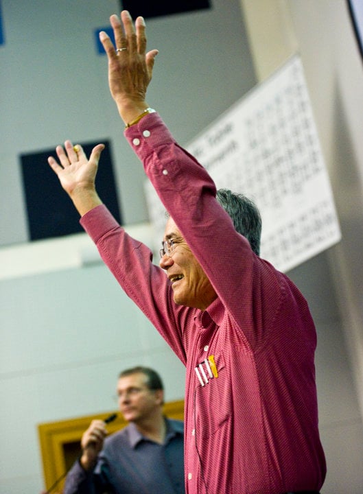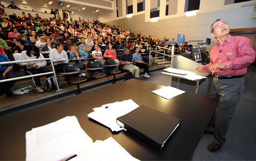20 (of 24) Professor Ei-ichi Negishi acknowledges his sophomore organic chemistry class as they give him an enthusiastic ovation after being introduced by Dr Robert Wild, Assistant Head of Chemistry at Purdue University in West Lafayette, Indiana, on 6 October 2010. Despite being notified of his Nobel Prize earlier in the day, Dr Negishi remained committed to teaching his class that afternoon.