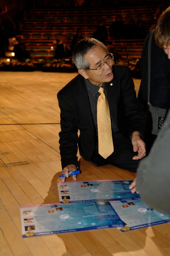 Ei-ichi Negishi signing Nobel posters at Aula Magna, Stockholm University, 8 December 2010.