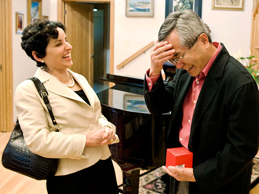 21 (of 24) Professor Ei-ichi Negishi shares a joke with Purdue University President France A. Córdova at Dr Negishi's home, following the announcement of the Nobel Prize.