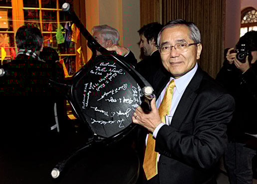 Like many Nobel Laureates before him, Ei-ichi Negishi autographs a chair at Kafé Satir at the Nobel Museum in Stockholm, 6 December 2010.Copyright © Scanpix 2010 Photo: Janerik Henriksson/Scanpix