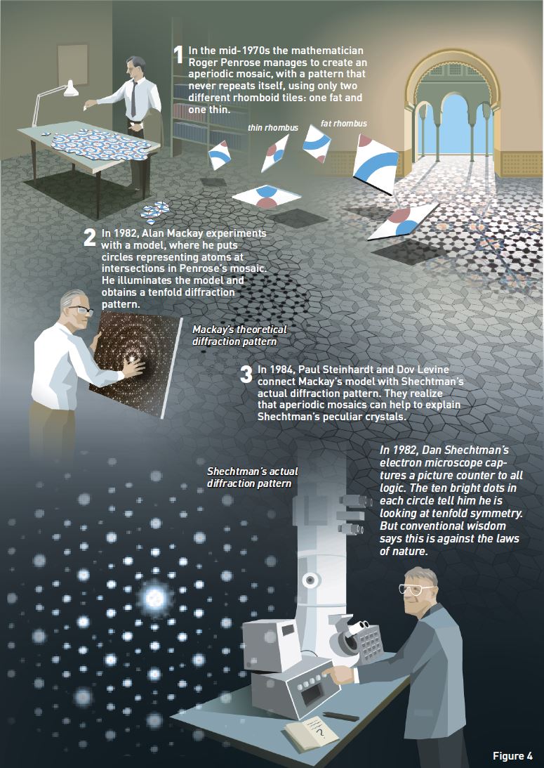 When Dan Shechtman entered the discovery awarded with the Nobel Prize in Chemistry 2011 into his notebook, he jotted down three question marks next to it. The atoms in the crystal in front of him yielded a forbidden symmetry. It was just as impossible as a football – a sphere – made of only sixcornered polygons. Since then, mosaics with intriguing patterns and the golden ratio in mathematics and art have helped scientists to explain Shechtman’s bewildering observation.