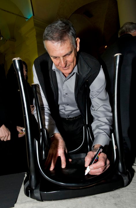 Like many Nobel Laureates before him, Dan Shechtman autographs a chair at Bistro Nobel at the Nobel Museum in Stockholm, 6 December 2011.