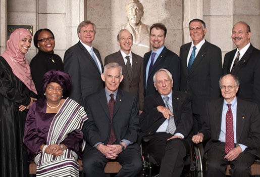 Eleven of the thirteen 2011 Nobel Laureates assembled for a group photo during their visit to the Nobel Foundation in Stockholm, 12 December 2011. Back row, left to right: Nobel Peace Prize Laureates Tawakkol Karman and Leymah Gbowee, Nobel Laureates in Physics Brian P. Schmidt, Saul Perlmutter and Adam G. Riess, Nobel Laureate in Chemistry Dan Shechtman and Nobel Laureate in Physiology or Medicine Bruce A. Beutler. Front row, left to right: Nobel Peace Prize Laureate Ellen Johnson Sirleaf, Laureate in Economic Sciences Christopher A. Sims, Nobel Laureate in Literature Tomas Tranströmer and Laureate in Economic Sciences Thomas J. Sargent.