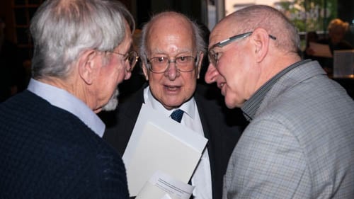 Nobel Laureates Martin Karplus (left) and Peter Higgs (middle) in a discussion at the Nobel Museum in Stockholm, 6 December 2013.
