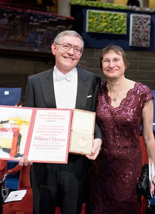 William E. Moerner with his wife, Mrs Sharon Stein Moerner, on stage after the Nobel Prize Award Ceremony at the Stockholm Concert Hall.
