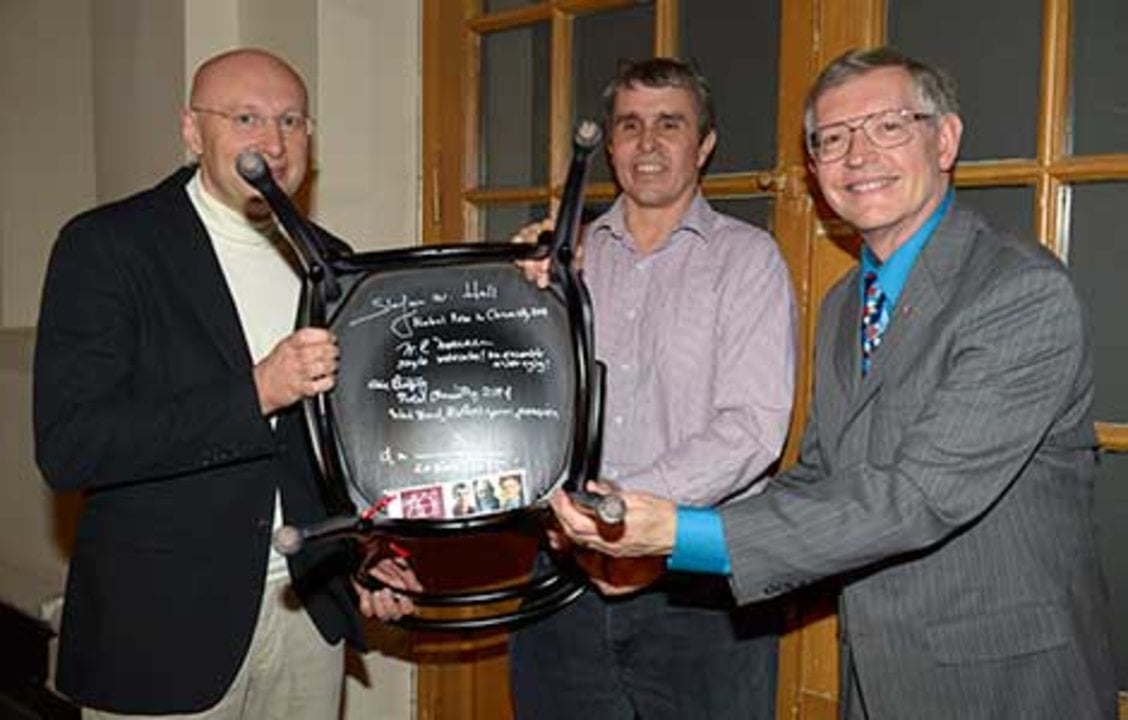 All three Nobel Laureates in Chemistry, from left: Stefan W. Hell, Eric Betzig and William E. Moerner, with their autographed chair in Bistro Nobel at the Nobel Museum in Stockholm, 6 December 2014.