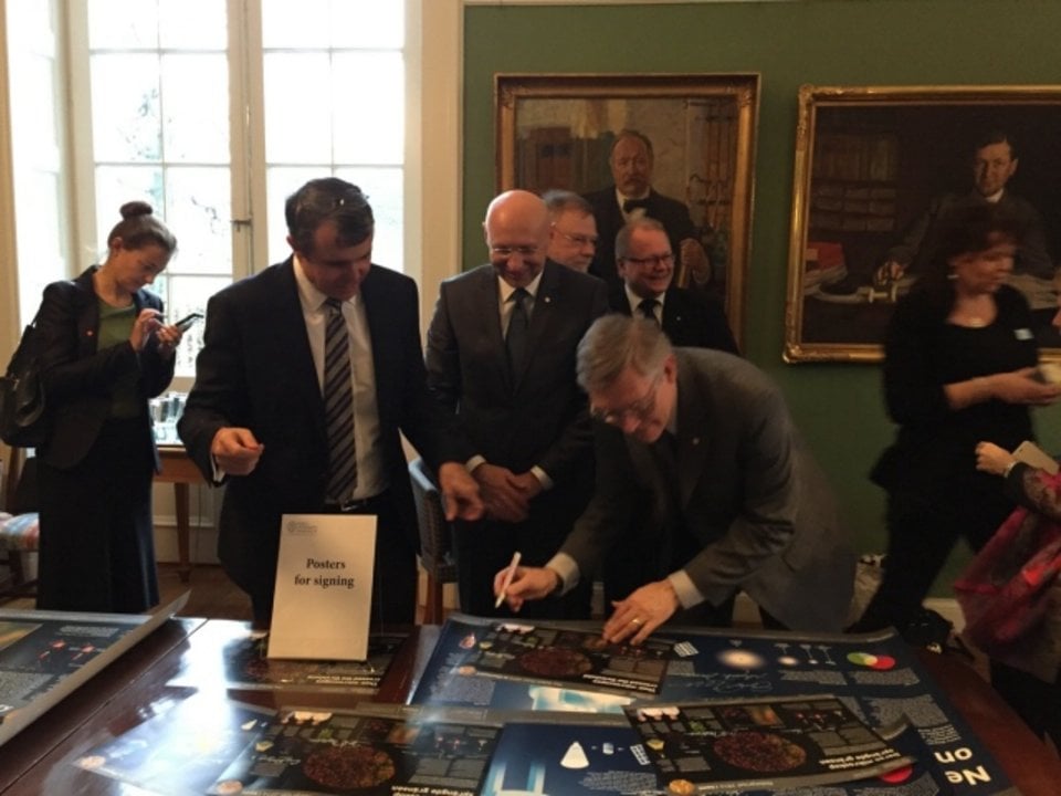 All three Chemistry Laureates signing posters at the Royal Swedish Academy of Sciences on 7 December 2014.