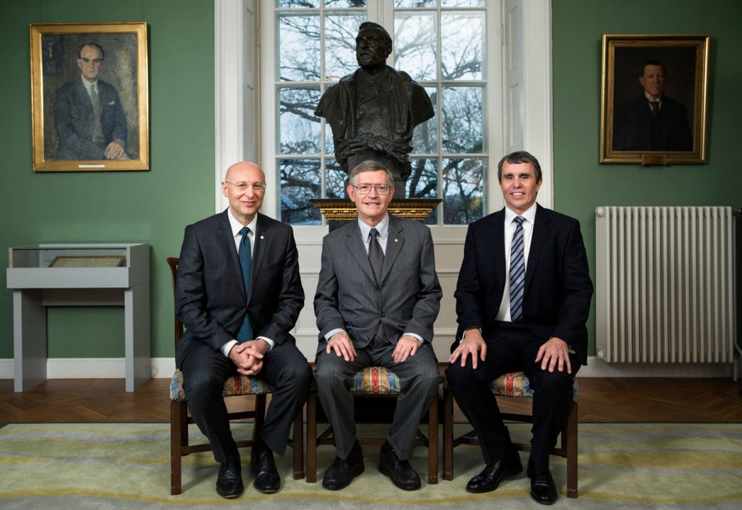 All three Chemistry Laureates assembled at the Royal Swedish Academy of Sciences on 7 December 2014. From left: Stefan W. Hell, William E. Moerner and Eric Betzig.