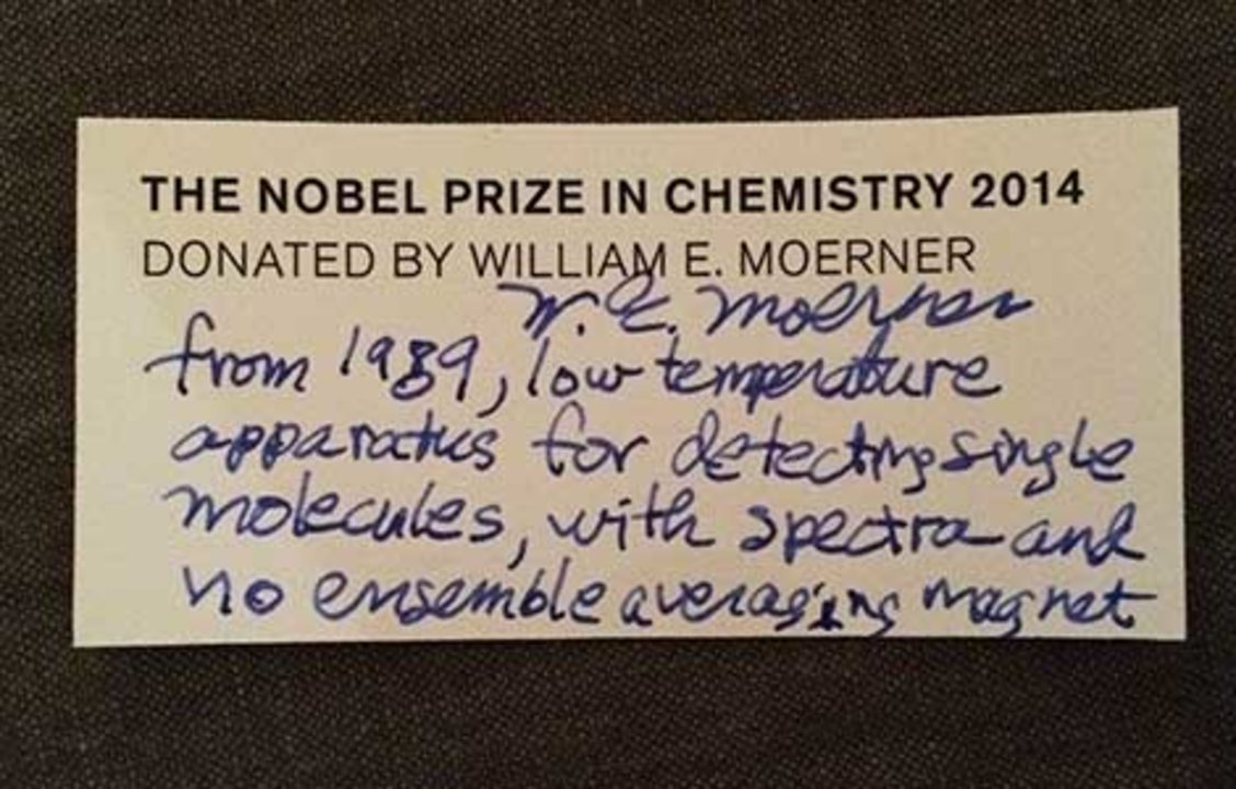 William E. Moerner's hand-written label on the gift to the Nobel Museum.