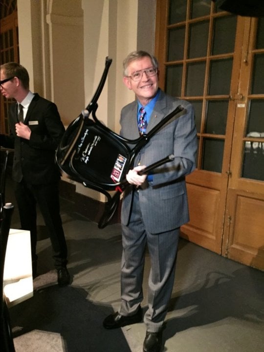 Like many Nobel Laureates before him, William E. Moerner autographs a chair at Bistro Nobel at the Nobel Museum in Stockholm, 6 December 2014.