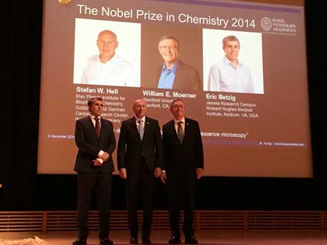 All three Chemistry Laureates assembled at stage after the Nobel Lectures in the Aula Magna, Stockholm University, on 8 December 2014. From left: Eric Betzig, Stefan W. Hell and William E. Moerner.