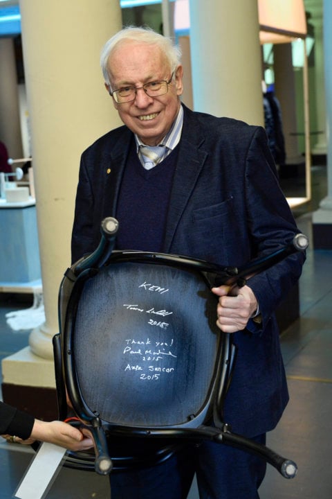 12 (of 16) Nobel Laureate Tomas Lindahl and the autographed chair at the Nobel Museum in Stockholm.