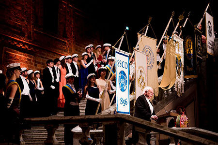 Nobel Laureates at the Nobel Prize Award Ceremony. From left: Physics Laureates Takaaki Kajita and Arthur B. McDonald, Chemistry Laureates Tomas Lindahl, Paul Modrich and Aziz Sancar, Medicine Laureates William C. Campbell, Satoshi Ōmura and Tu Youyou, Literature Laureate Svetlana Alexievich and Laureate in Economic Sciences Angus Deaton.