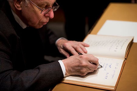 Tomas Lindahl signs the Nobel Foundation's guest book, signed by the Laureates since 1952, during his visit to the Nobel Foundation on 12 December 2015.