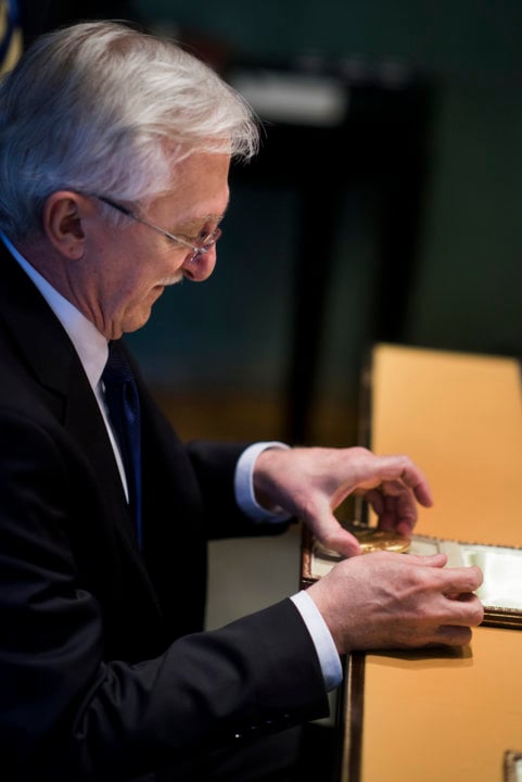 Paul Modrich takes a closer look at his Nobel Medal during his visit to the Nobel Foundation on 12 December 2015. On this occasion, the Laureates retrieve the Nobel diploma and Medal, which have been displayed in the Golden Hall of the City Hall following the Nobel Prize Award Ceremony. The Laureates also discuss the details concerning the transfer of their prize money.