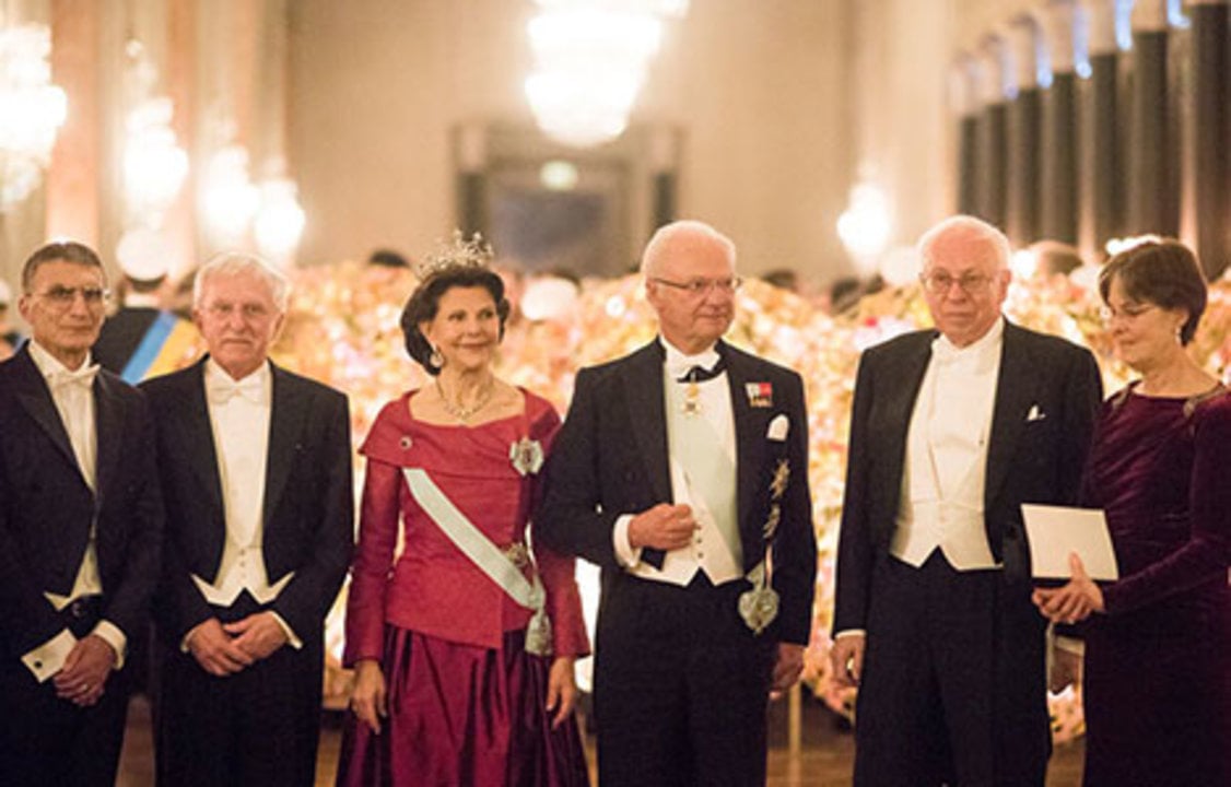 7 (of 13) The Swedish Royal Family receives the Nobel Laureates and their significant others in the Prince's Gallery. From left: Chemistry Laureates Aziz Sancar and Paul Modrich, Queen Silvia and King Carl XVI Gustaf of Sweden, Chemistry Laureate Tomas Lindahl, and Dr Vickers Burdett, partner of Paul Modrich.