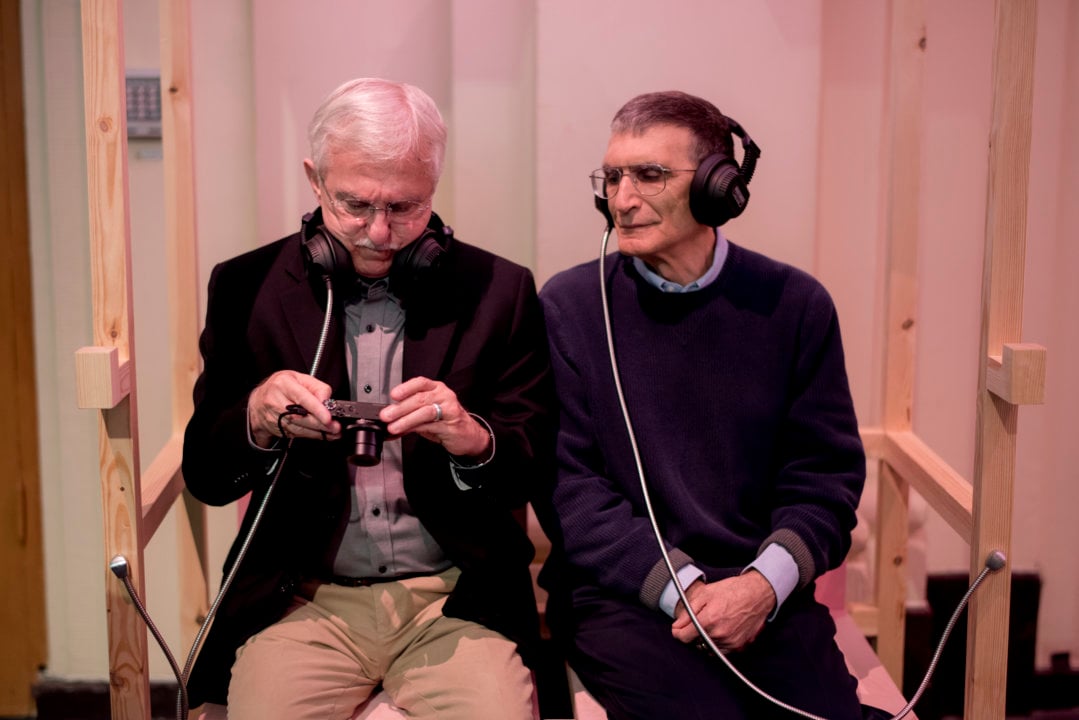13 (of 13) Chemistry Laureates Paul Modrich (left) and Aziz Sancar (right) listen to a musical interpretation of the Chemistry Prize - a melody determined by DNA's four nitrogen bases, A, G, C and T - at the exhibition Nobel Creations at the Nobel Museum in Stockholm, 6 December 2015.