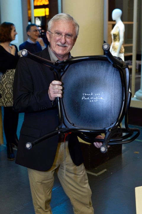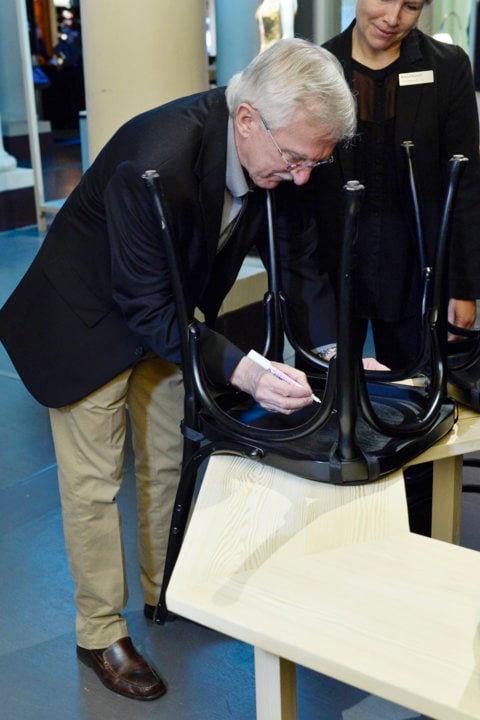 10 (of 13) Like many Nobel Laureates before him, Paul Modrich autographs a chair at Bistro Nobel at the Nobel Museum in Stockholm, 6 December 2015.