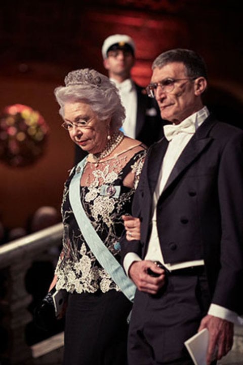 Aziz Sancar and Princess Christina of Sweden proceed into the Blue Hall of the Stockholm City Hall for the Nobel Banquet on 10 December 2015.