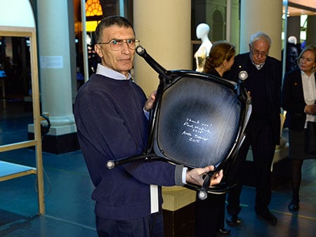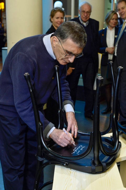 9 (of 12) Like many Nobel Laureates before him, Aziz Sancar autographs a chair at Bistro Nobel at the Nobel Museum in Stockholm, 6 December 2015.