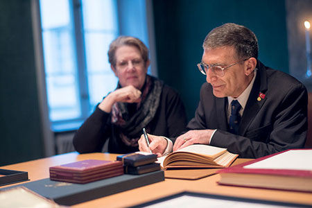Aziz Sancar signs the Nobel Foundation's guest book, signed by the Laureates since 1952, during his visit to the Nobel Foundation on 12 December 2015. His wife, Professor Esta Sancar, is watching.