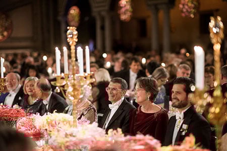 Aziz Sancar and Dr Vickers Burdett, partner of Chemistry Laureate Paul Modrich, at the table of honour.