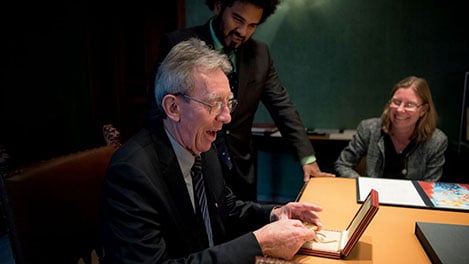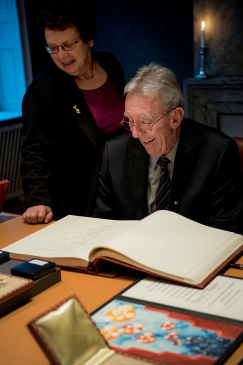 Jean-Pierre Sauvage and his wife Mrs Simone Carmen Boni take a look in the Nobel Foundation's guest book, signed by the Laureates since 1952, during his visit to the Nobel Foundation on 12 December 2016.