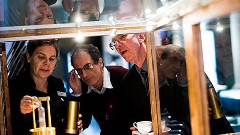 Jean-Pierre Sauvage (right) examines Marie Curie's radiation measurement apparatus at the Nobel Museum's exhibition 'Experiment'.