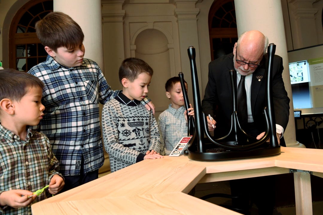 Sir J. Fraser Stoddart with his grandchildren, children of relatives and friends showing his autographed chair at the Nobel Museum in Stockholm.