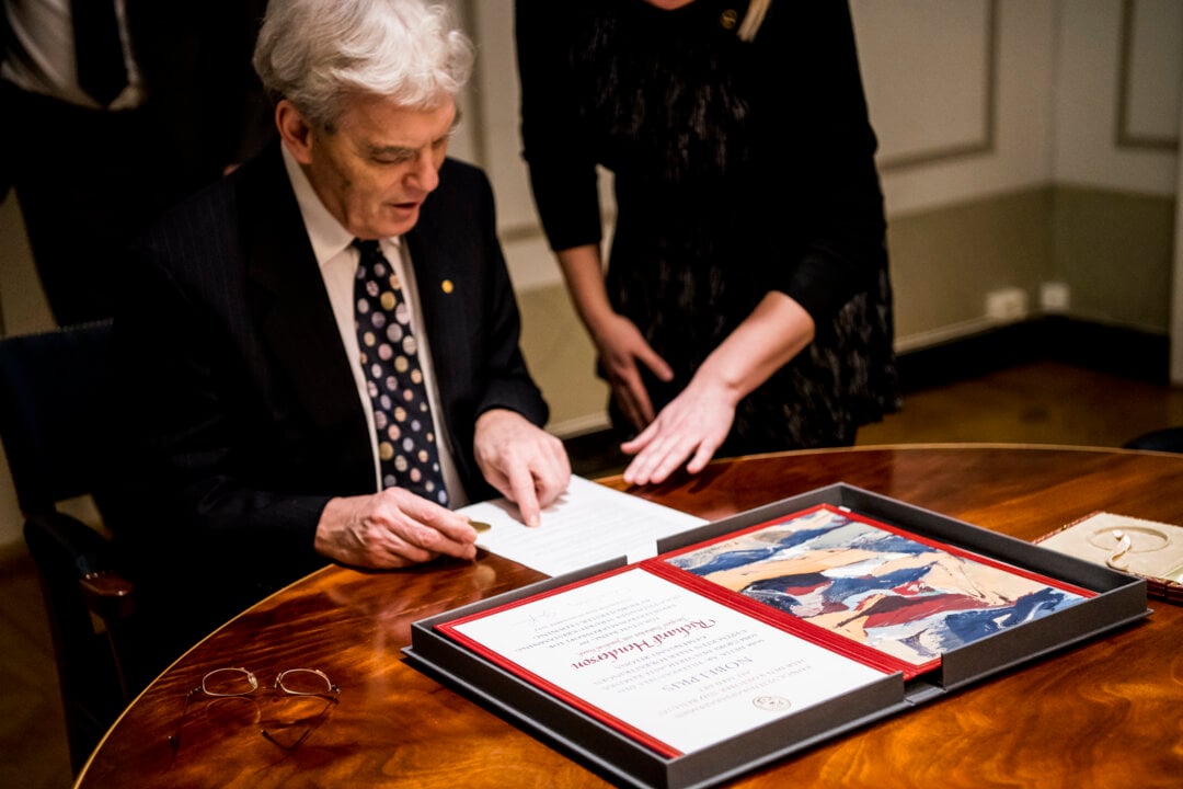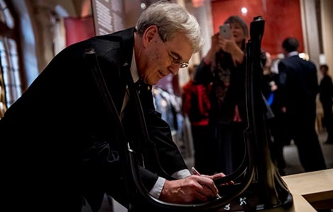 Like many Nobel Laureates before him, Richard Henderson autographs a chair at the 2017 Nobel Laureates' Get together at the Nobel Museum in Stockholm on 6 December 2017.