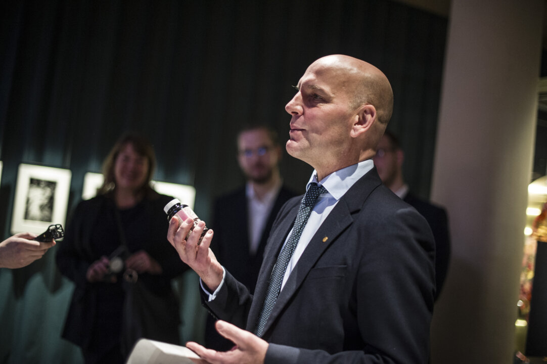 6 (of 15) Chemistry laureate Benjamin List presenting his gift to the Nobel Prize Museum's collection: jar of dietary supplements. The supplements are made of the substance prolin, which plays a key role in List’s discovery. Photo taken 6 December 2022.
