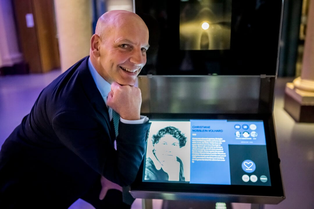 7 (of 15) 2021 chemistry laureate Benjamin List beside a photo of his aunt, 1995 medicine laureate Christiane Nüsslein-Volhard, at the Nobel Prize Museum in Stockholm on 6 December 2022.