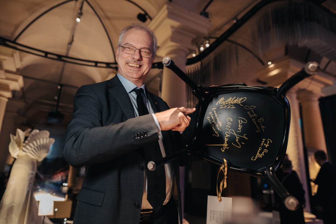 10 (of 14) Like many laureates before him, Morten Meldal signed a chair at the 2022 Nobel Prize laureates' Get together at the Nobel Prize Museum in Stockholm on 6 December 2022.