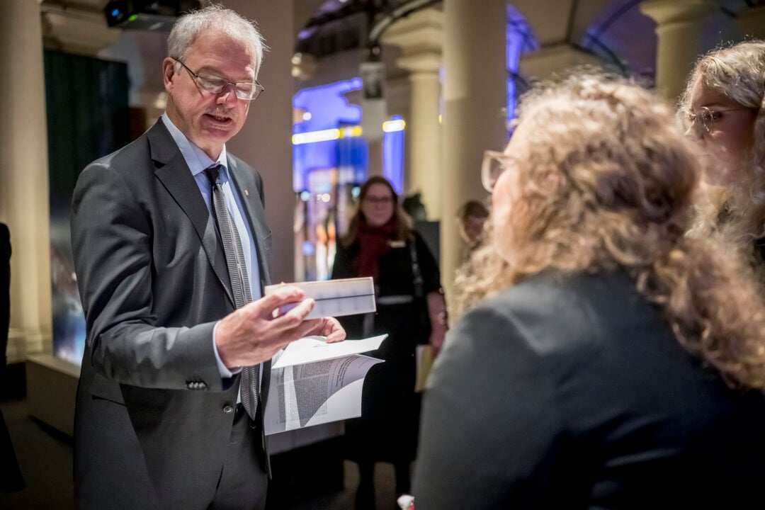 11 (of 14) Chemistry laureate Morten Meldal taking a look at the exhibition in the Nobel Prize Museum.